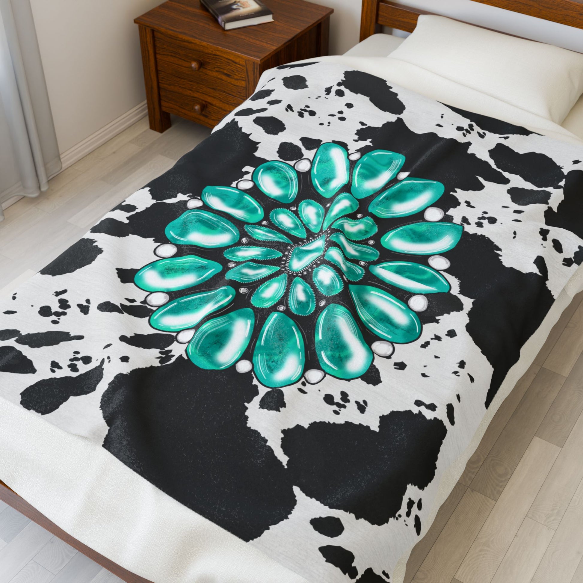 Western Velveteen Plush Blanket Cowhide Chic Turquoise Concho