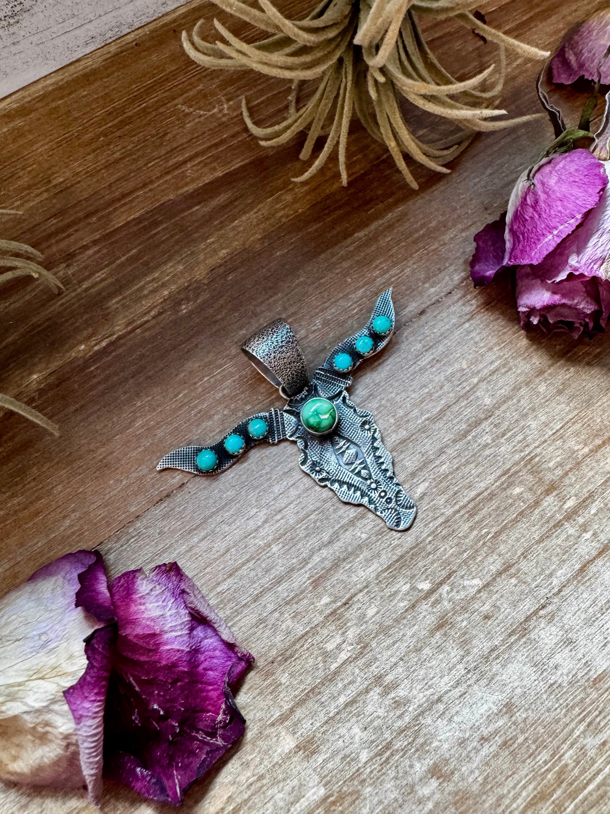 This one-of-a-kind longhorn pendant is handmade in the USA by Native artist Leroy James. Crafted in sterling silver and accented with gold details, it’s stamped for authenticity and artistry. The pendant is designed to fit a 12mm sterling silver pearl strand and features a 12mm bail. A bold Western statement piece and a true collector’s item.