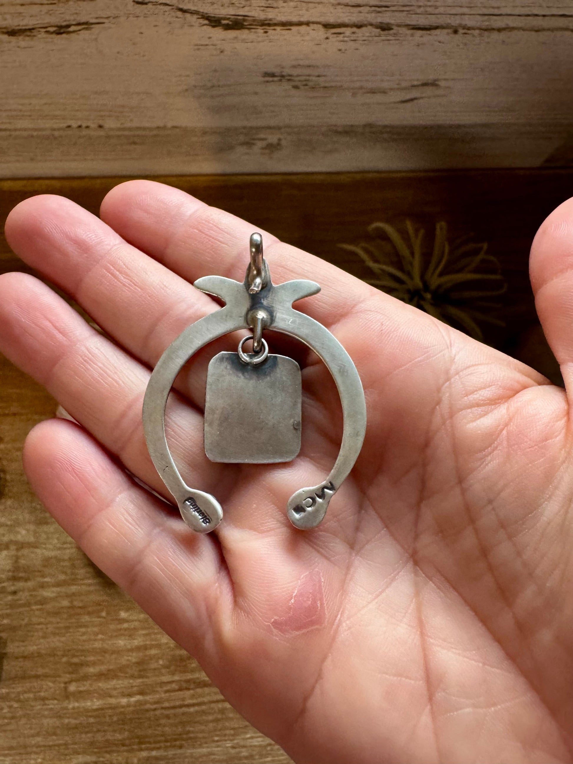 Handmade in the USA, this sterling silver Naja pendant features a unique purple spiny oyster stone with hints of yellowfor a stunning color blend. Stamped MC for authenticity, it reflects expert Native silversmithing and one-of-a-kind natural shell variation. The bail is designed to fit pearl strands, making it versatile for pairing with sterling silver pearls or layering with other Southwestern jewelry.