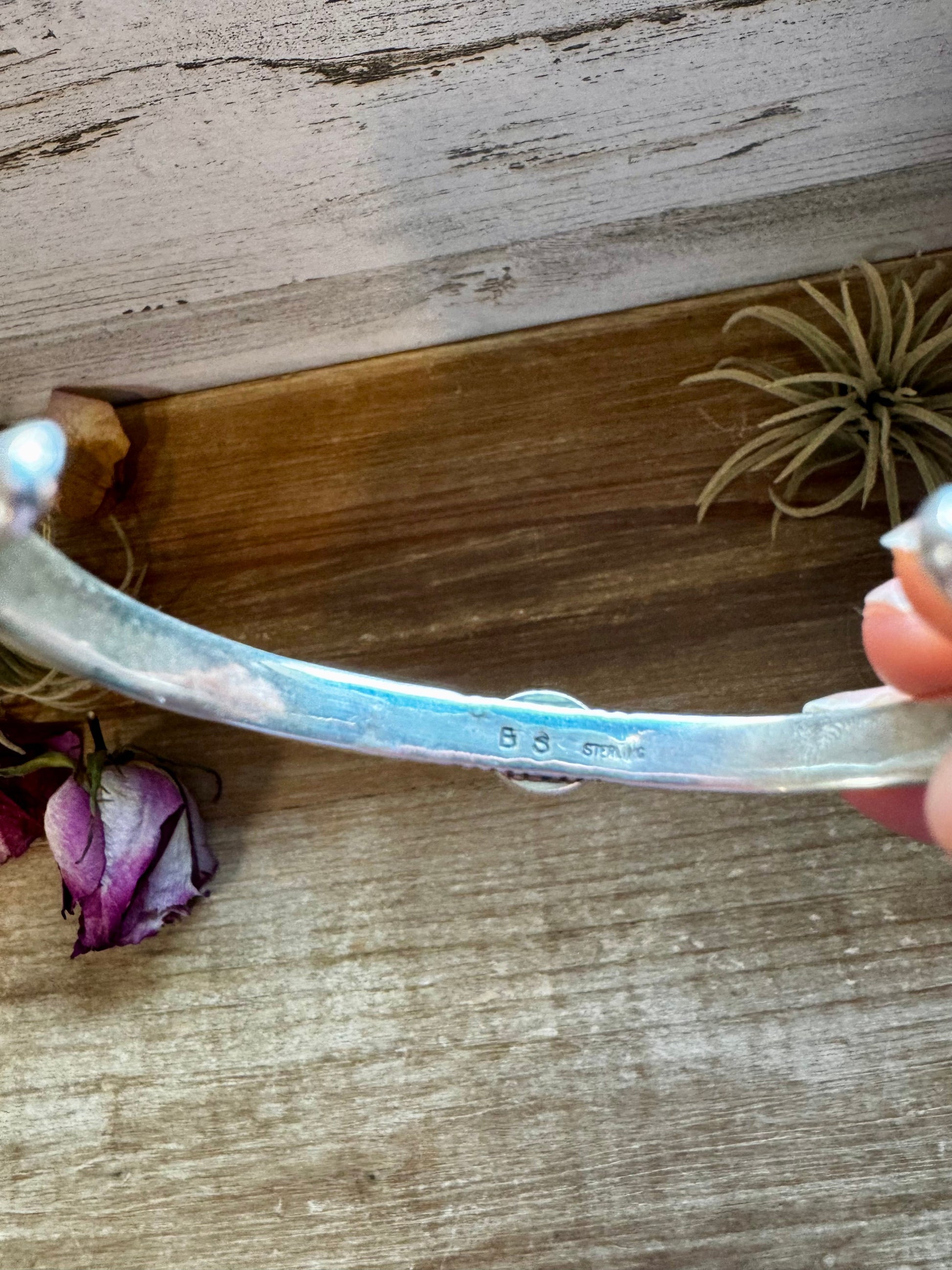 Handmade in the USA, these sterling silver cuff bracelets feature bold orange spiny oyster stones set in thick, solid silver. Stamped BS for authenticity, each cuff shows exceptional stamp work and detailed silversmithing. Substantial and durable, these cuffs are crafted with high-quality silver and vibrant spiny oyster, making them standout statement pieces. Two very similar cuffs are available.