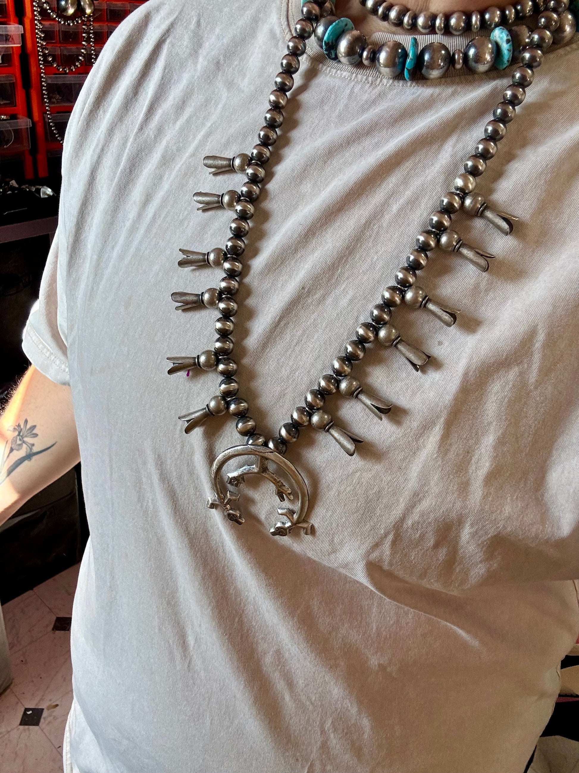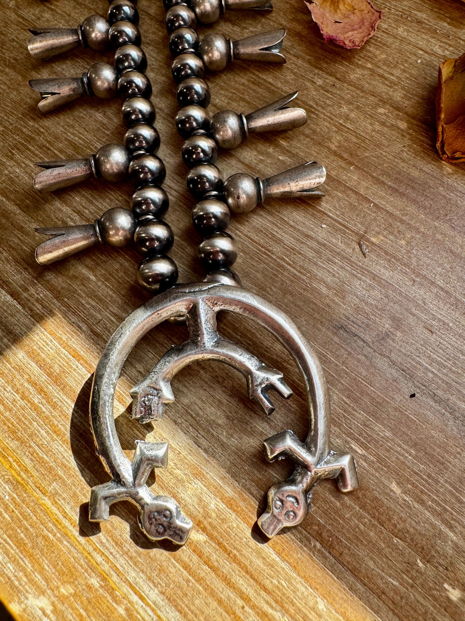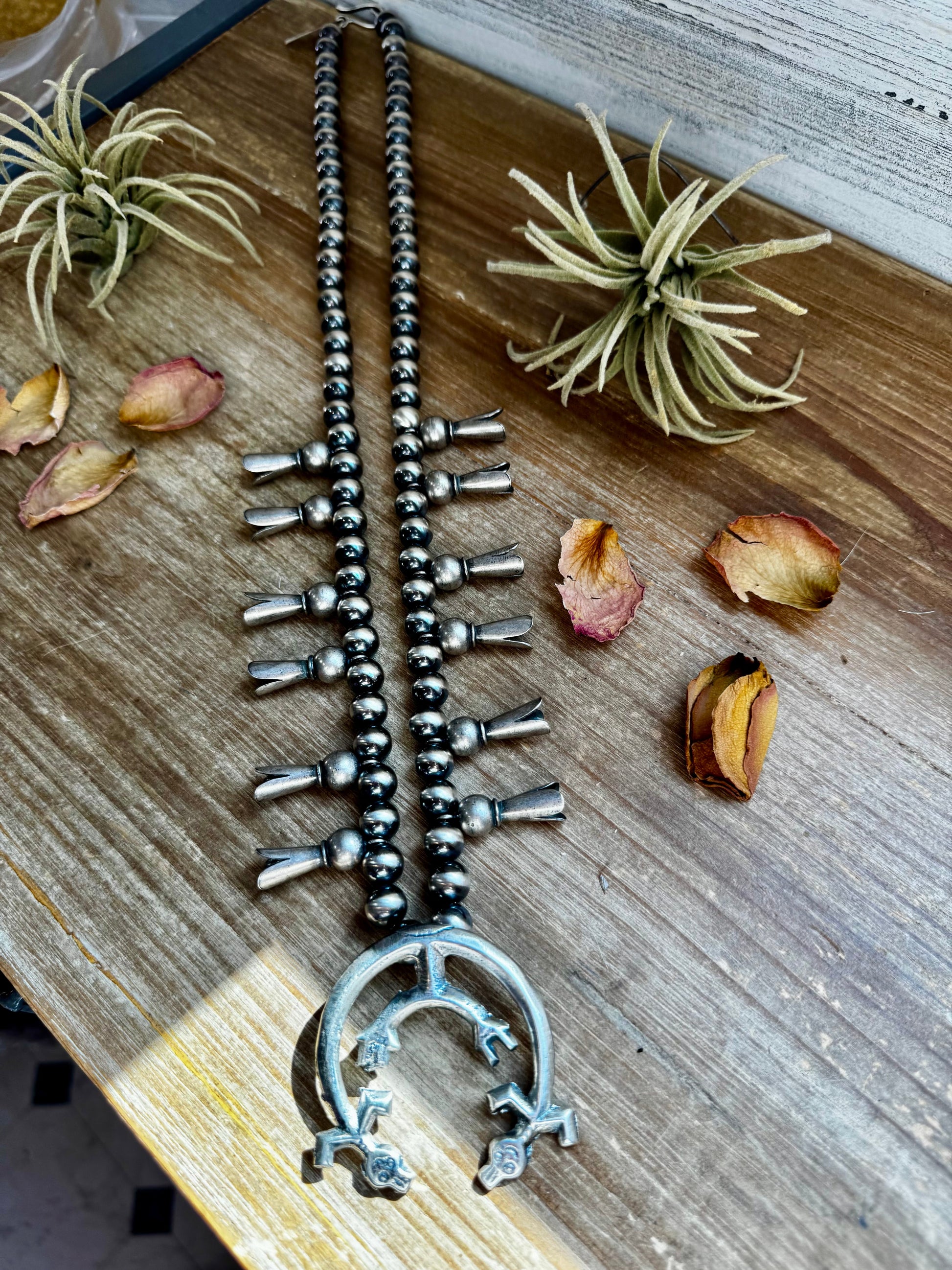 This stunning squash blossom–style necklace is handcrafted in New Mexico with sterling silver 10mm beads, featuring beautifully detailed blossoms on each side. Finished with a sharper hook clasp, this 30-inch necklace is an elegant and timeless Western classic made to stand out.