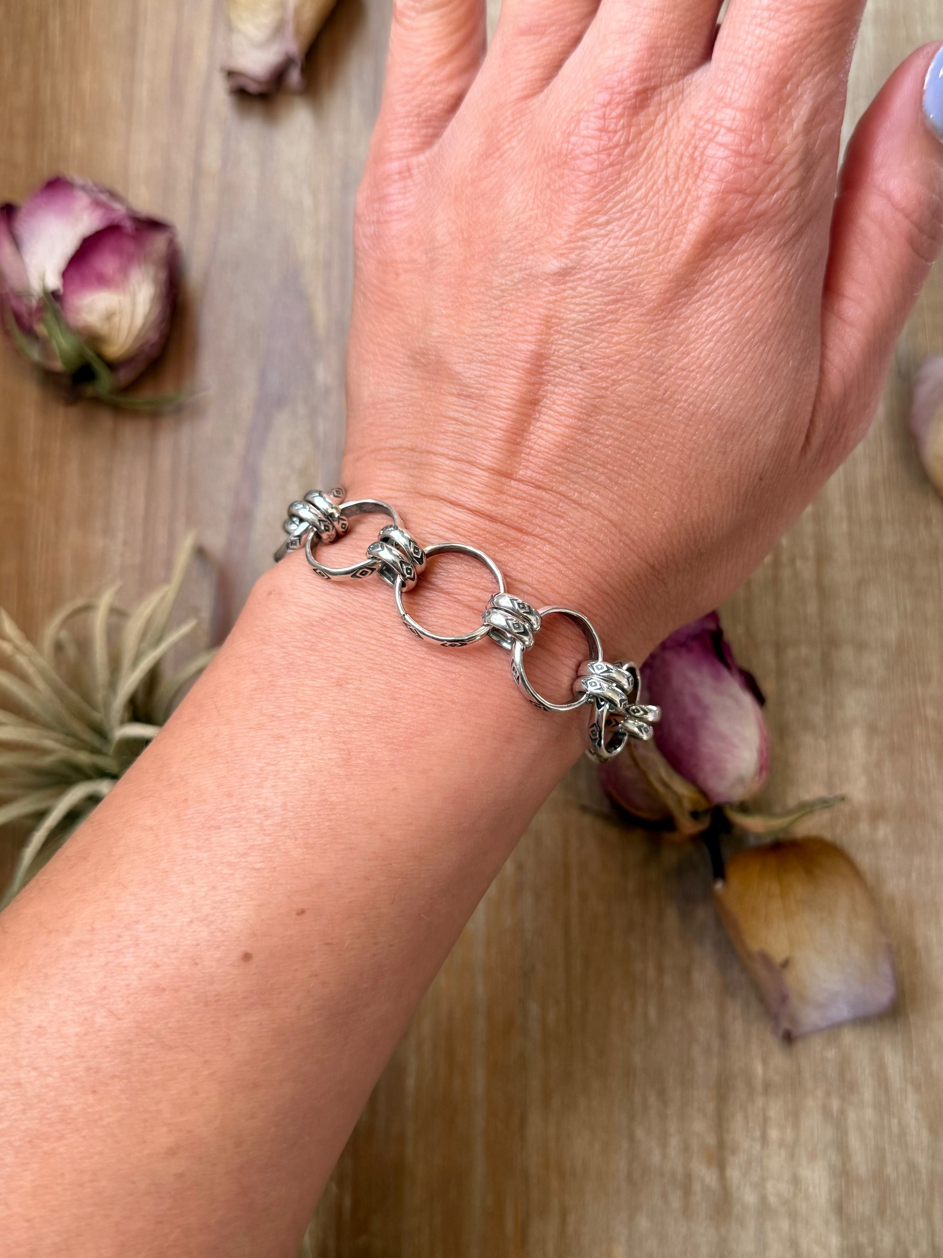 This sterling silver charm chain bracelet by artist Jason Ogg features the signature Medicine Man Eye pattern hand-stamped along each link. Designed to fit a 7-inch wrist with a 2-inch extender, this piece combines durability with timeless Western detail. Each link is individually crafted and polished for a clean, bright silver finish — perfect for wearing alone or adding your favorite charms.