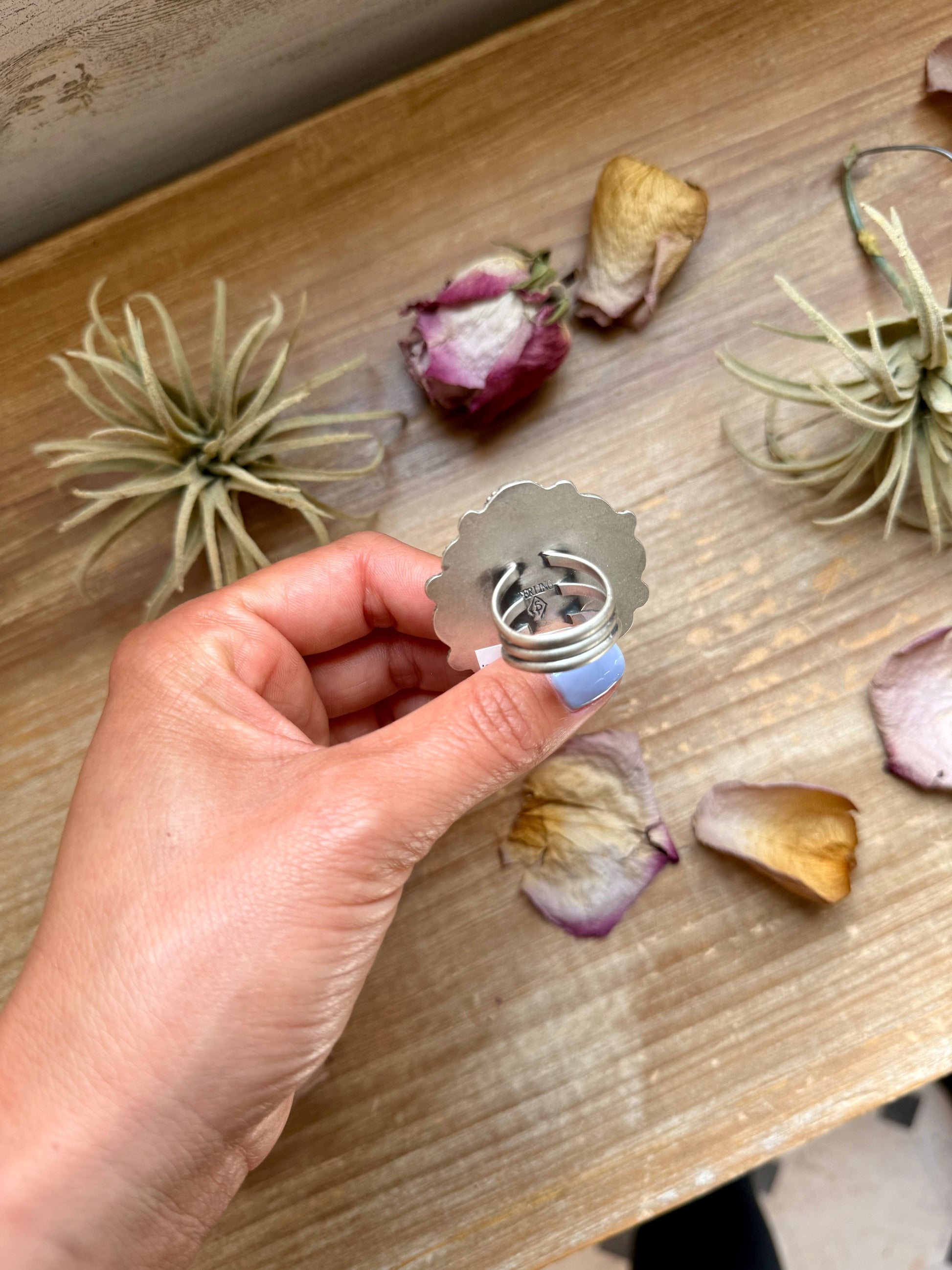 This handcrafted sterling silver cluster ring by artist Shay Pfeiffer showcases vibrant orange spiny oyster stones arranged in a classic floral cluster design. Each spiny oyster is hand-set to highlight its rich, natural color variations, creating a one-of-a-kind statement piece that radiates warmth and Western elegance.