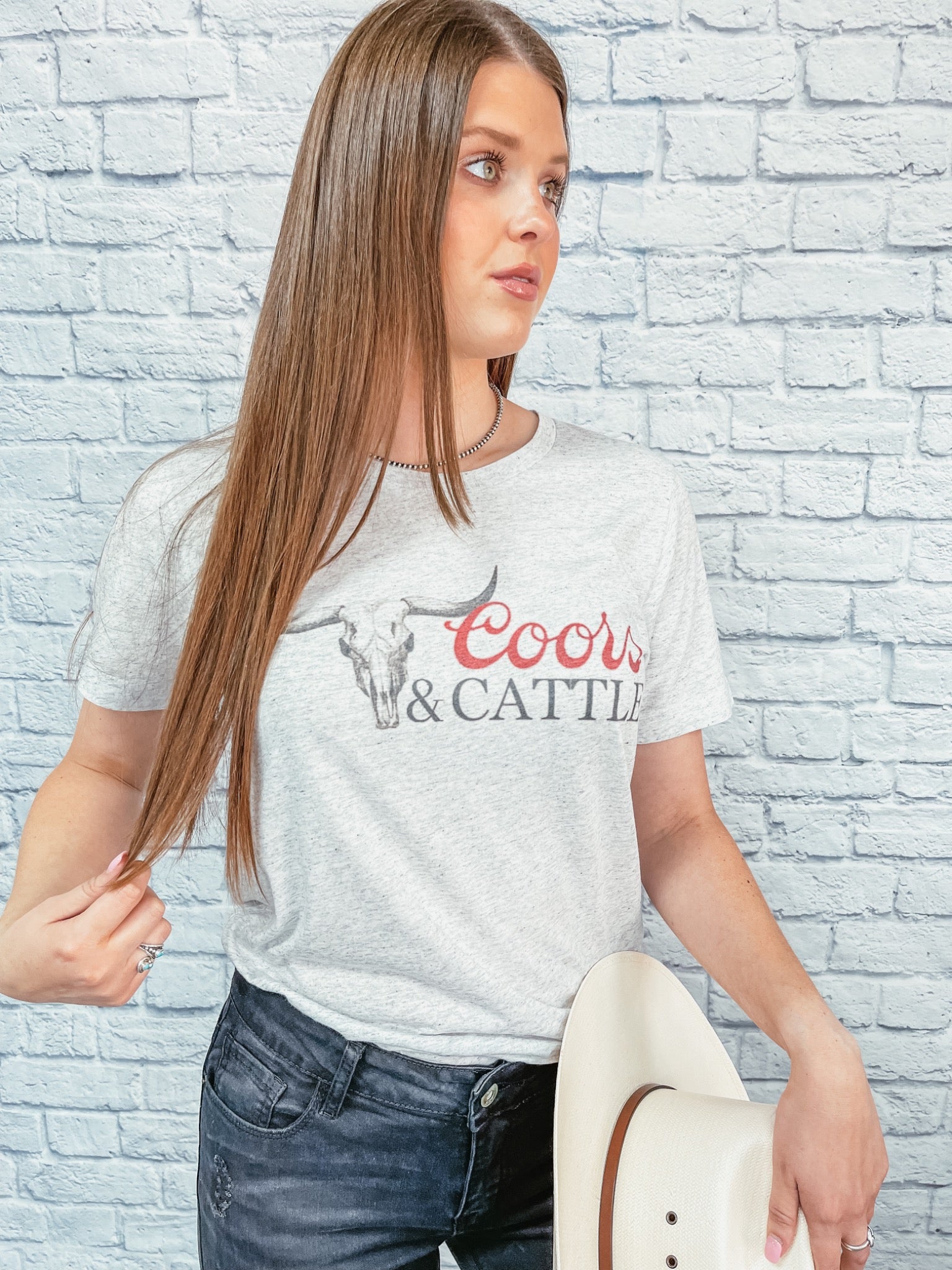 This Coors & Cattle graphic tee is the perfect mix of western grit and laid-back ranch style. Featuring a bold longhorn skull graphic with “Coors & Cattle” lettering, this tee brings modern cowgirl energy with a vintage-inspired edge. Made on a soft, lightweight Bella + Canvas White Fleck Triblend tee, it has that broken-in, boutique feel customers love with a flattering unisex fit that’s easy to dress up with boots or keep casual with denim.